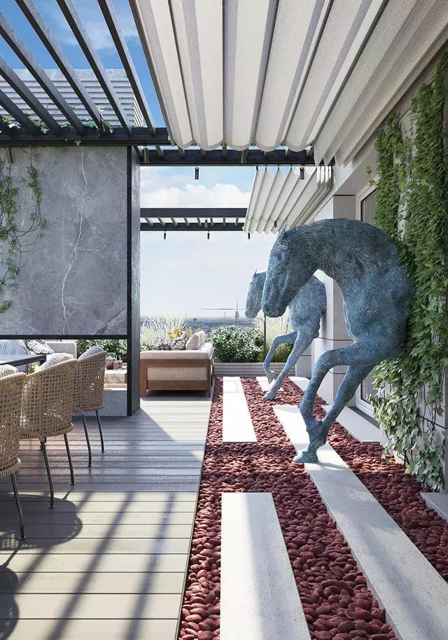 公寓還附帶一個 70 平方米的露臺,可以欣賞到城市的全景,并且有著非常特殊的裝飾主義風格。