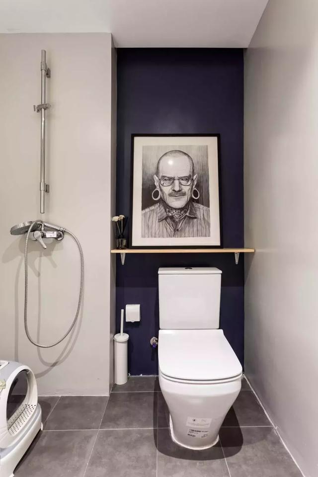 深淺防水漆的色彩對比,讓單調的空間層次得到豐富;馬桶上方還放置了一張黑白色的藝術畫,原來廁所也可以變得如此高雅~~