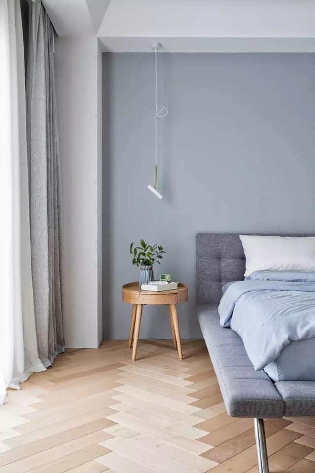 需要減少視覺壓力的時候,直接將白色紗簾拉起來,就能形成一個“純粹”的睡眠空間了。