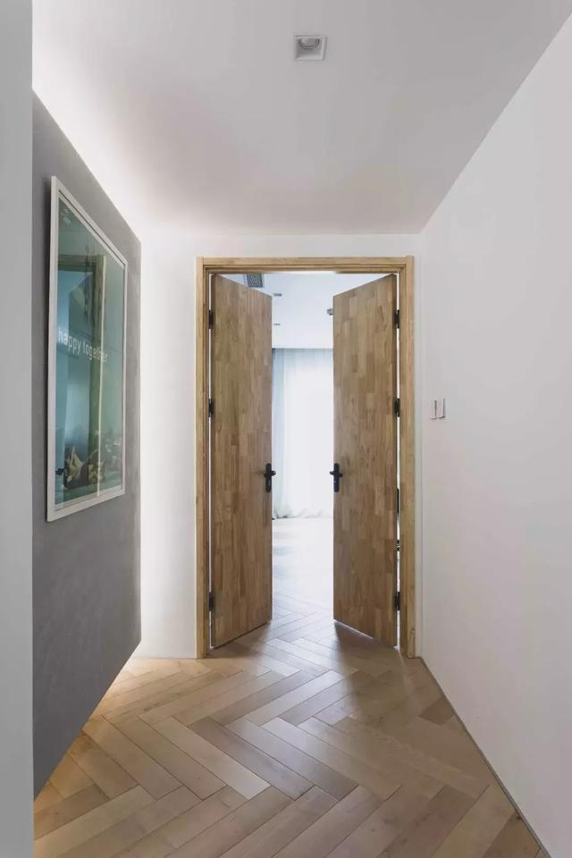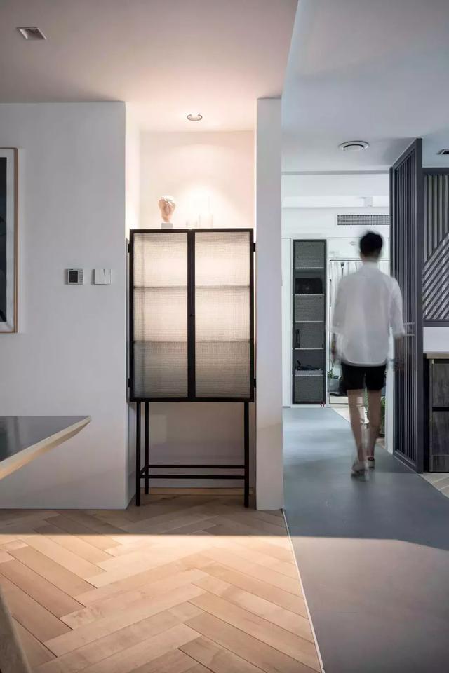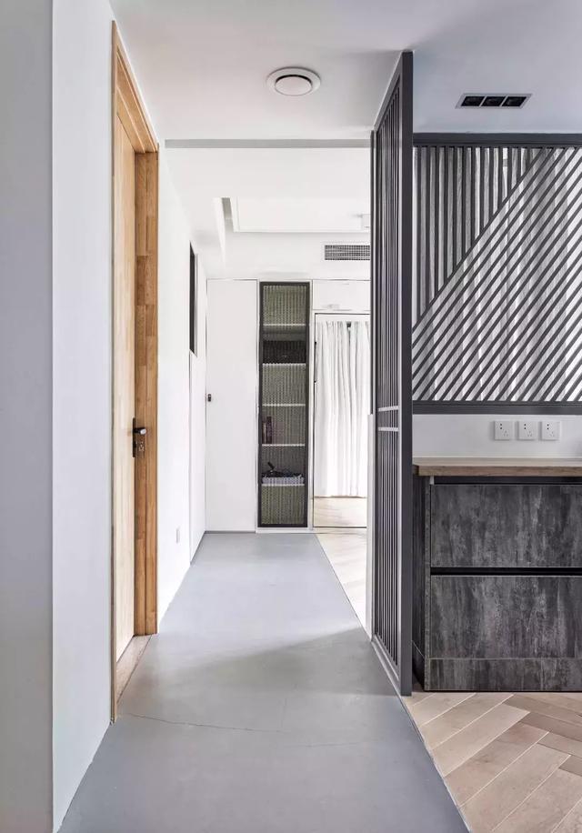 走廊空間為灰色水泥地面,與其他區域的人字形木地板,在視覺上做了功能上的區隔,并從玄關一直延伸至健身房。