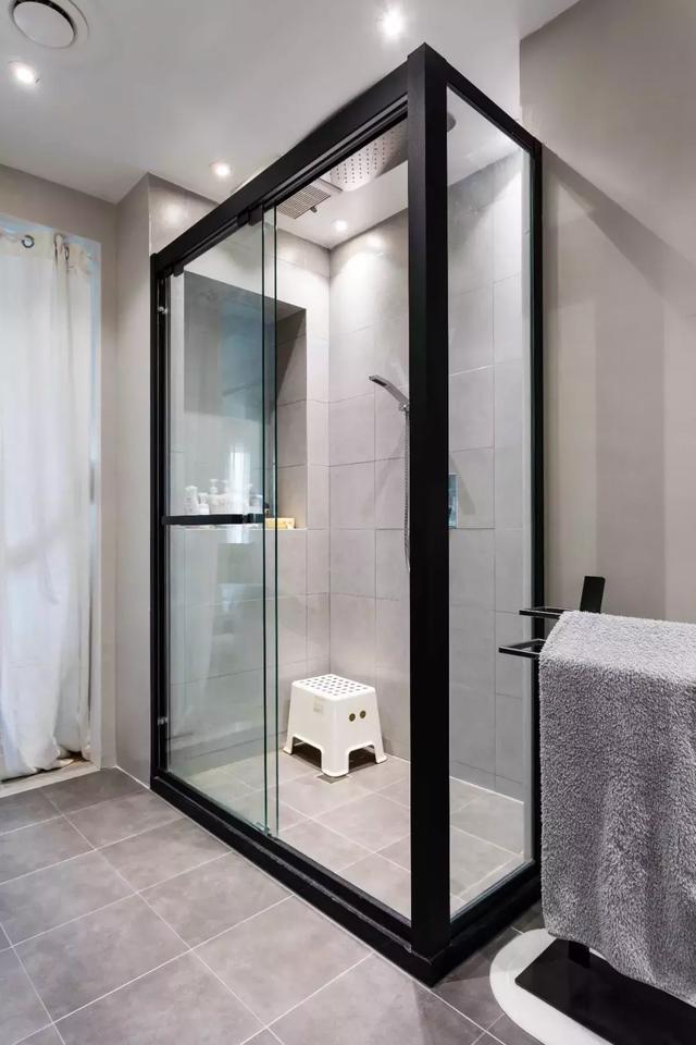 次衛延續了黑白灰色調,與整個家的風格形成了巧妙呼應;鏡子上方又搭配金屬壁燈,讓這個簡潔的空間更顯精致。