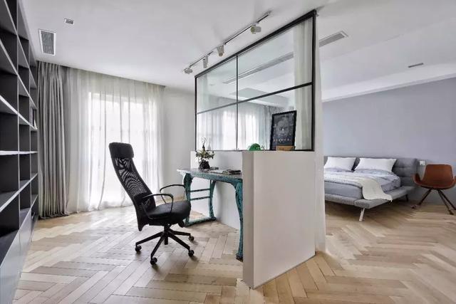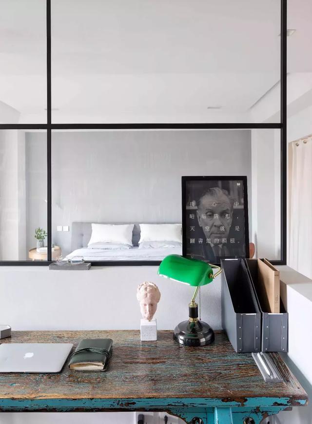 開放式書房與對面的床,采用半墻+半玻璃的形式做了隔斷,動線上非常明顯,空間保持彼此通透又具有互動性。