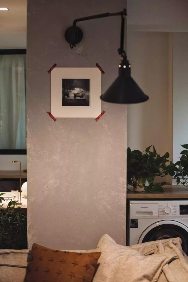 陽臺位于沙發背后的一處墻角,雖然空間面積不大,但剛好放得下一臺洗衣機和烘干機,清潔起來非常方便。