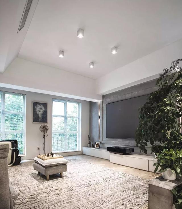 質感柔軟的家具配置,在帶來溫馨、舒適的感覺之余,又與冷峻的水泥灰電視墻進行了中和。
