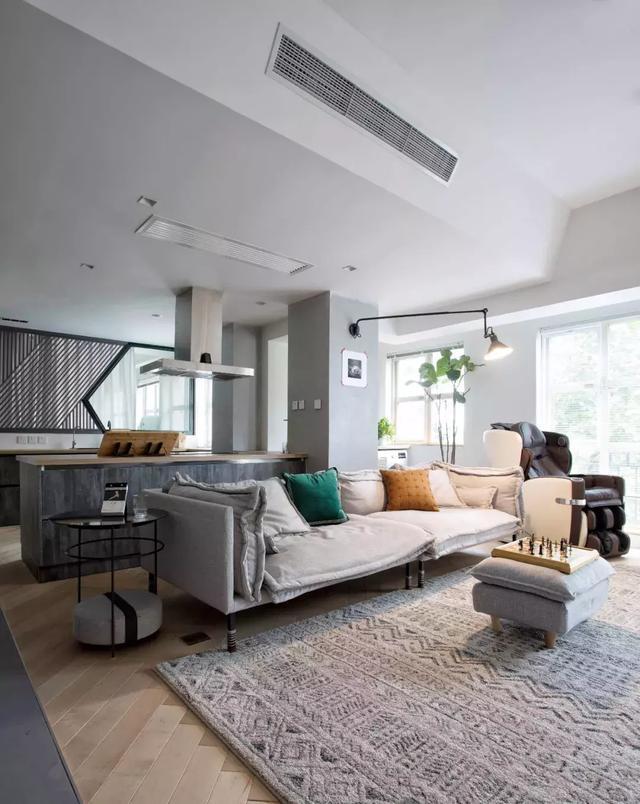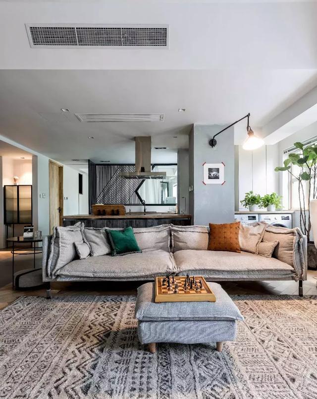 客廳的基本調性,是由一張低飽和度的灰色沙發,以及大面積的幾何圖案地毯來確定的,整體風格簡約舒適,同時又不乏時尚感。