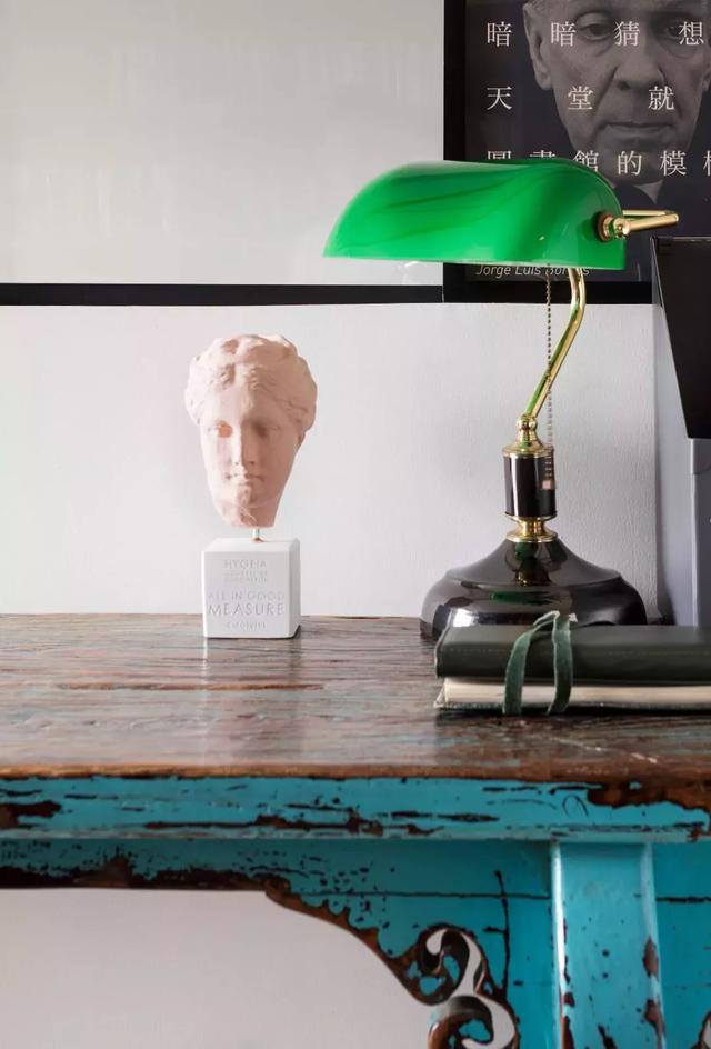 書房的陳設也很簡單,一個利落的黑色大書架,搭配一張顏色斑駁的古舊書桌,還有一盞民國時期的老上海臺燈,就營造出了一個安靜舒適的角落。