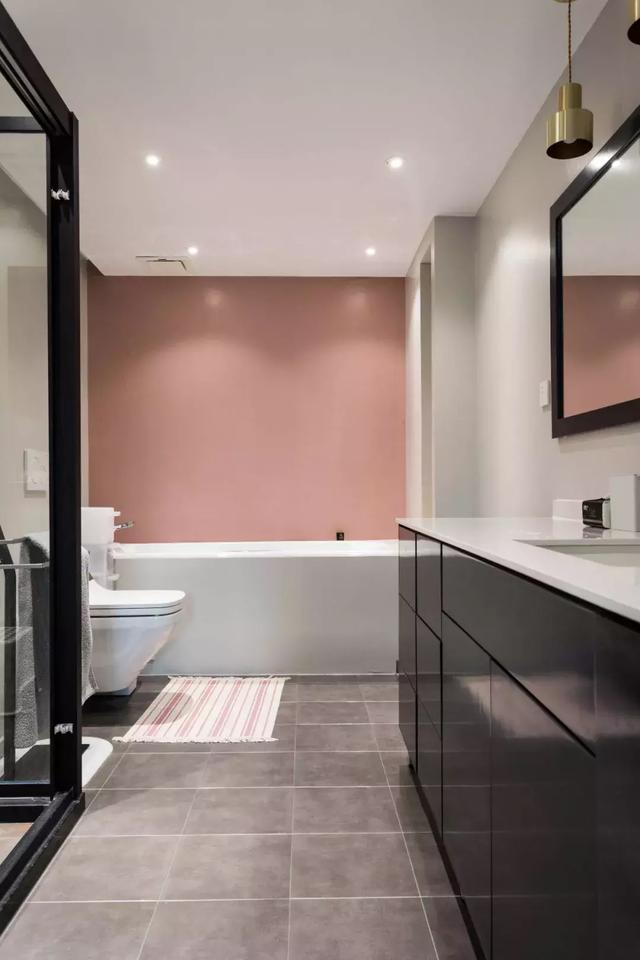 整個家的黑白灰+原木色調,在主衛區域發生了一點小小的改變。浴缸一側的那面臟粉色背景墻,正好戳中了姑娘心底的小柔軟。