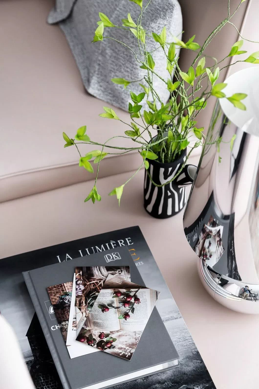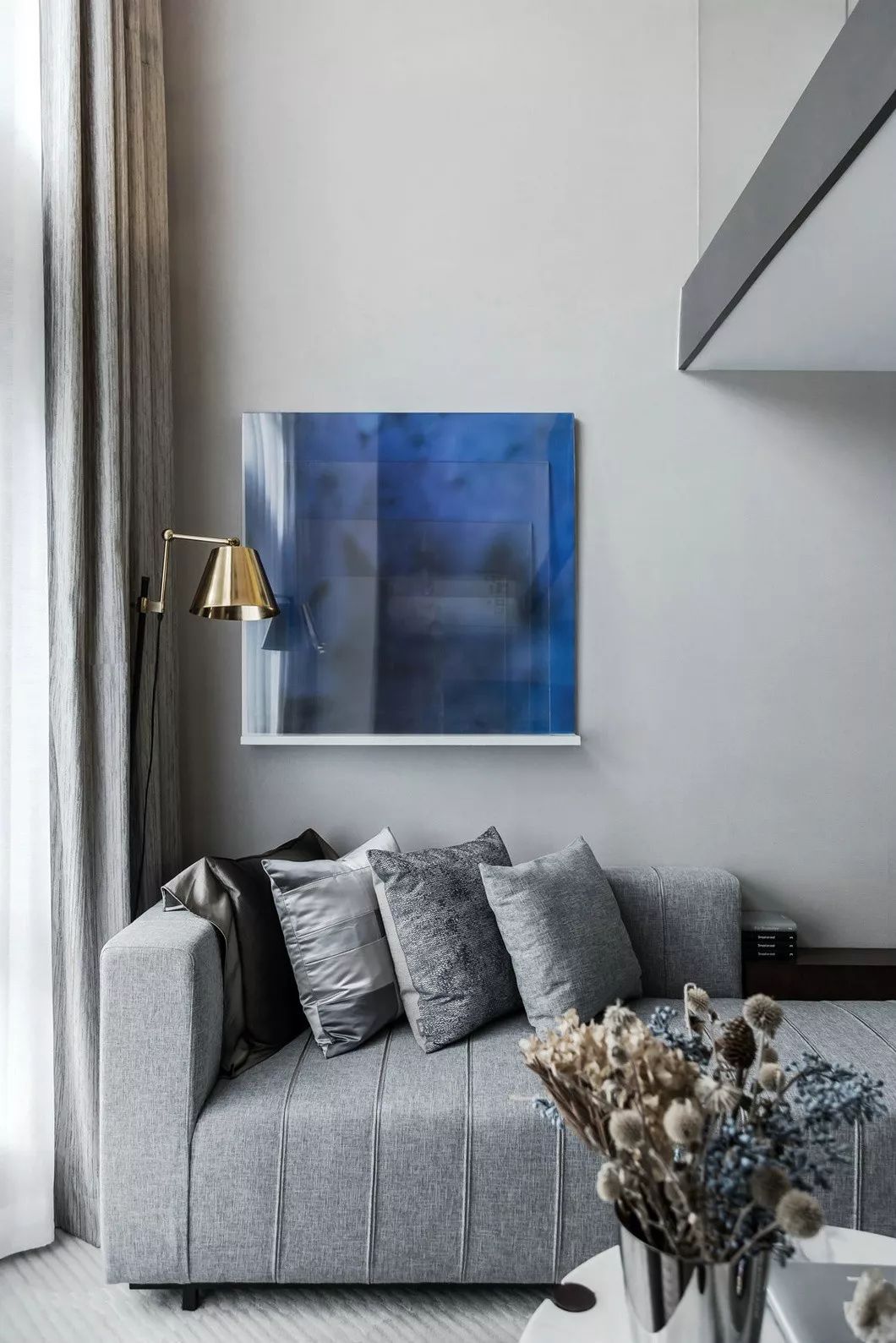 除了巧妙的布局,配色也是設計師打造精致小客廳的手法。大量的無彩色之下,用小面積的跳色與金屬光澤來中和壓抑和單調感,不喧賓奪主之余,人居其中亦能最大程度地感受空間因光的變化而變化,怡然自得。