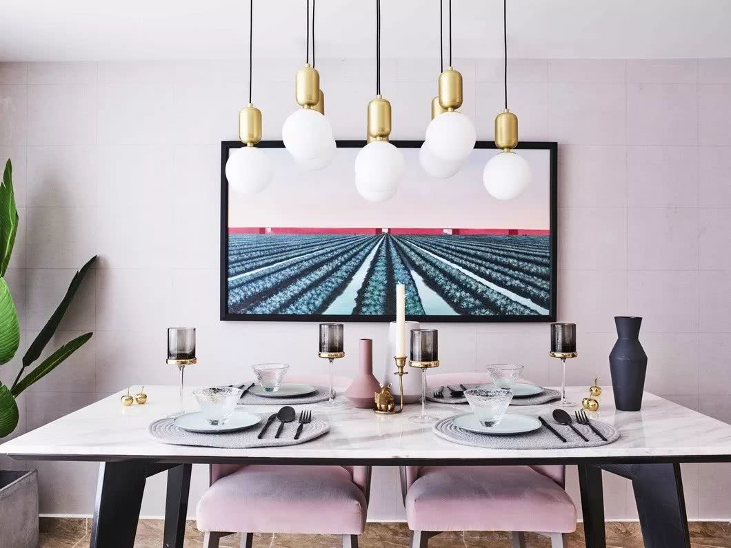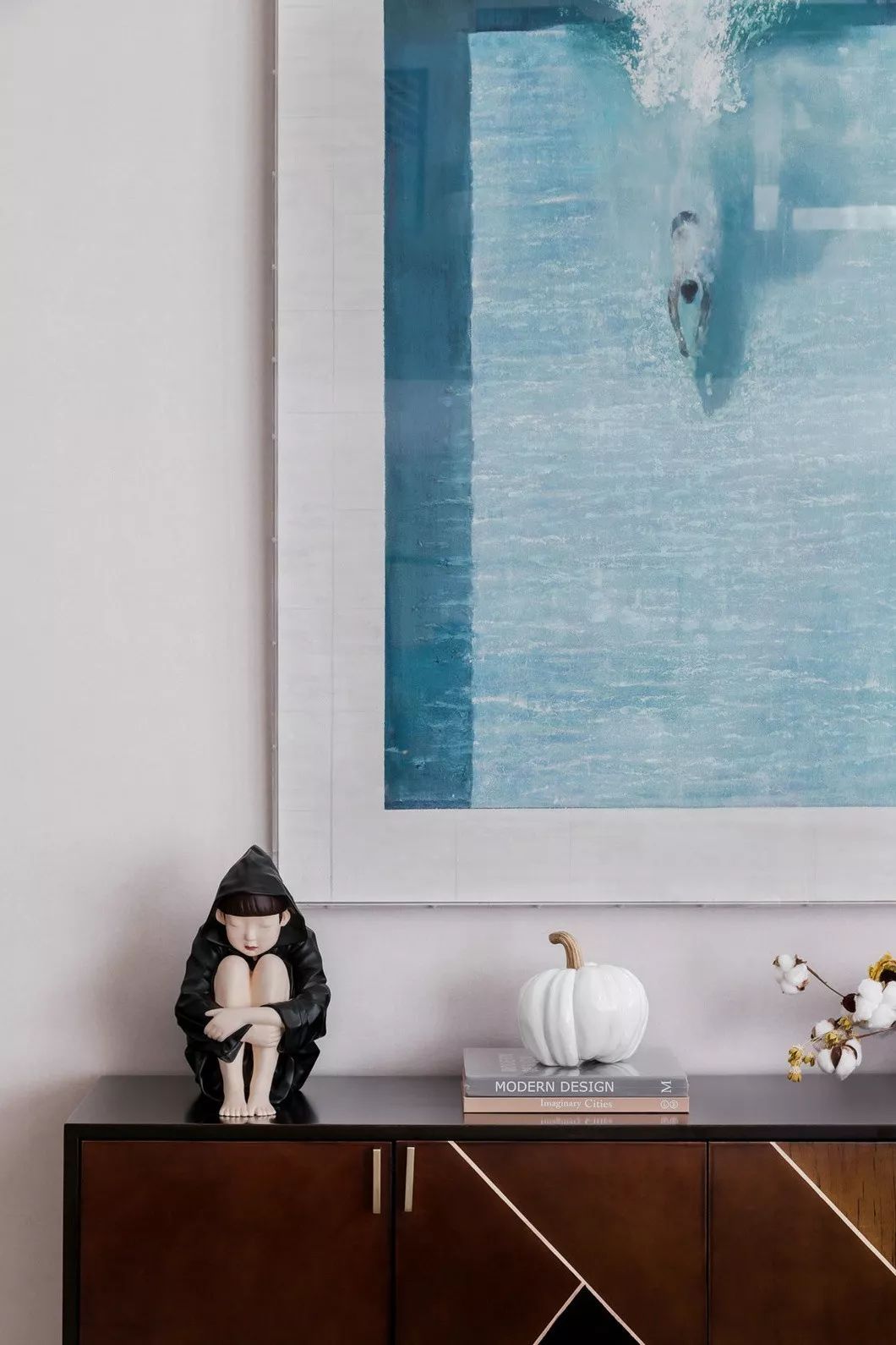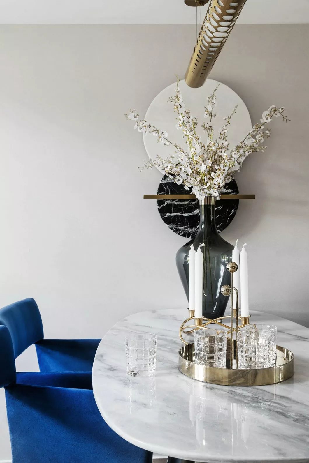 沙發后的高腳邊桌,既可以呈現就餐環境的多樣體驗,又彌補了沙發后面空白區。少許精致的藝術品就能豐富空間精神層面的表達。