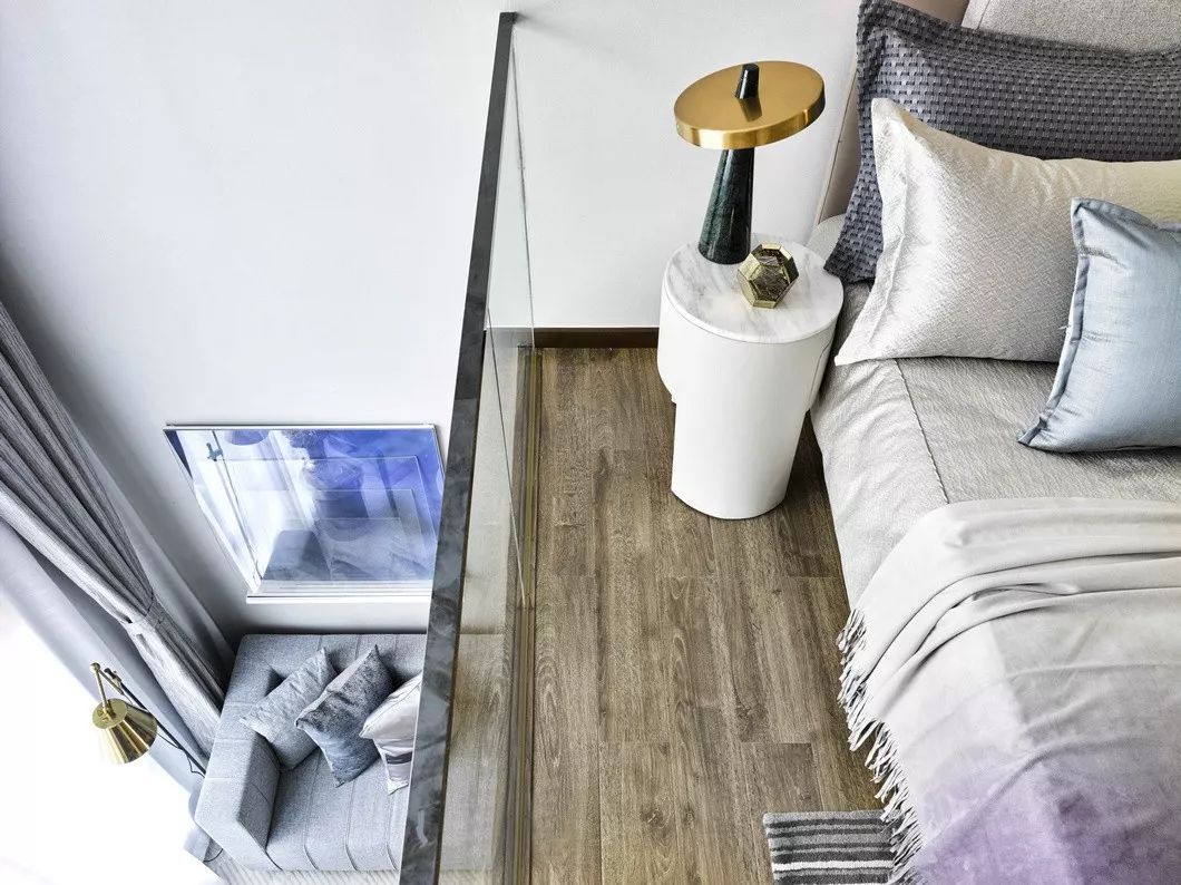 其中特別造型的床頭燈巧妙融入整體的風格,床品使用了淡藍,紫色和金屬色調,營造出精致的氛圍。