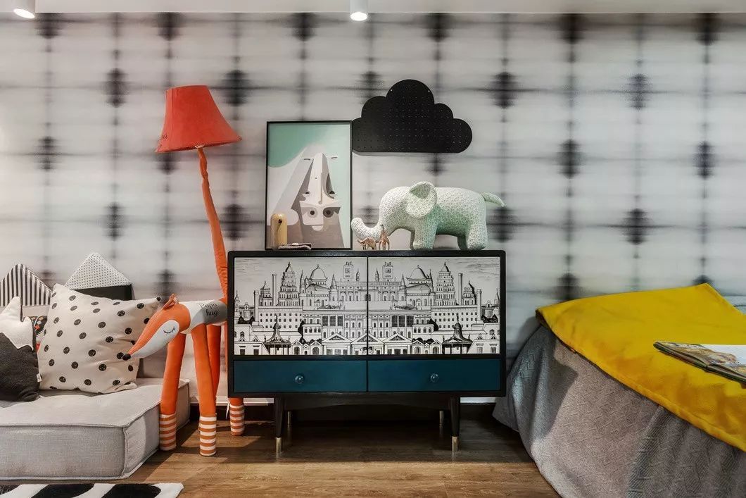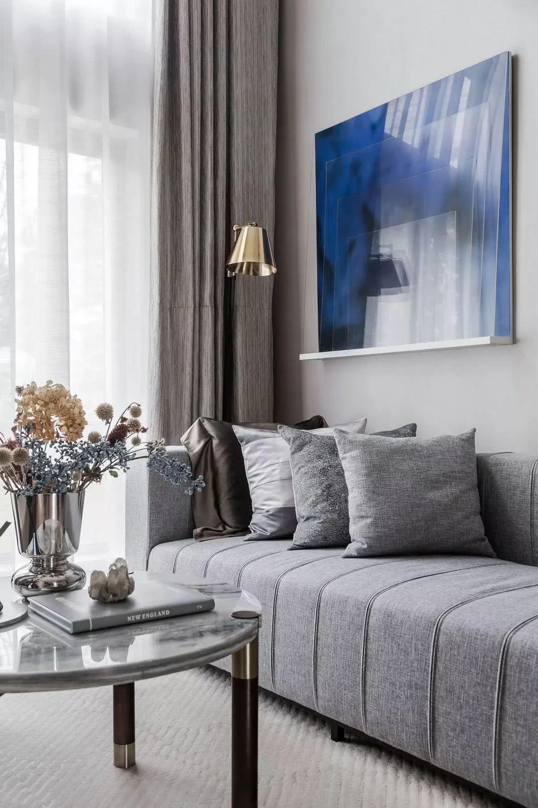 起居室格局較為狹長,設計師特地選用無拐角的長款灰色沙發,延伸舒適;造型小巧的茶幾不夠則大膽地使用兩個,通過在上面添置多種材質物料,豐富層次感;另一側的單人椅也線條清晰簡約,揮散局促感。