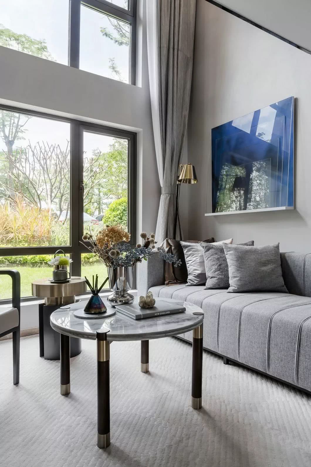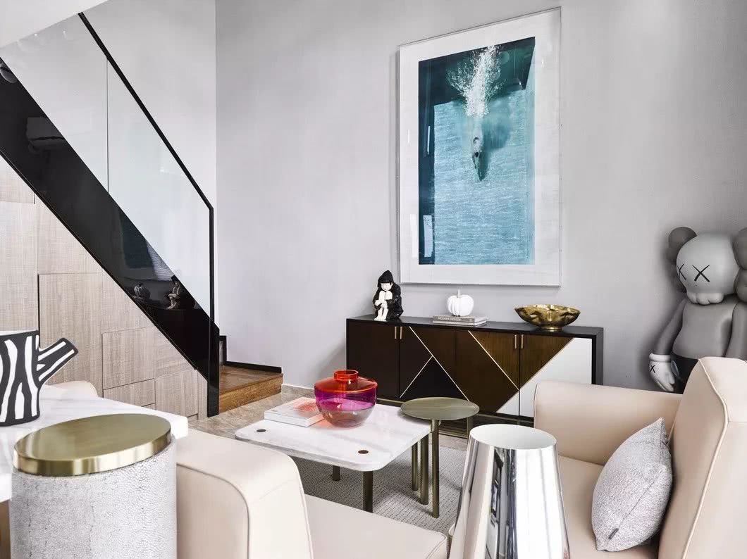 設計師為客廳搭配了整套杏粉色沙發。粉色的明亮度并不高,給人柔和的視覺效果的同時極具設計感。圓形和直線等的家具幾何形態為空間結構增添裝飾美感,灰墻上方搭配個性畫作,即不會顯得雜亂,又使得挑空區域在視覺效果上似乎更通透了一些。
