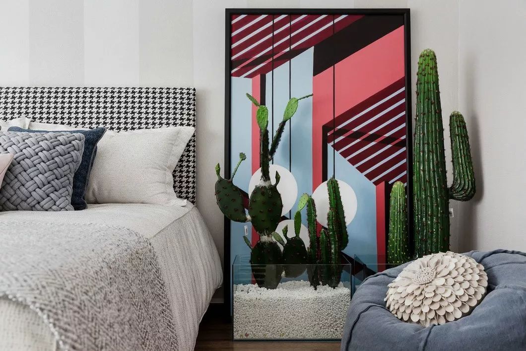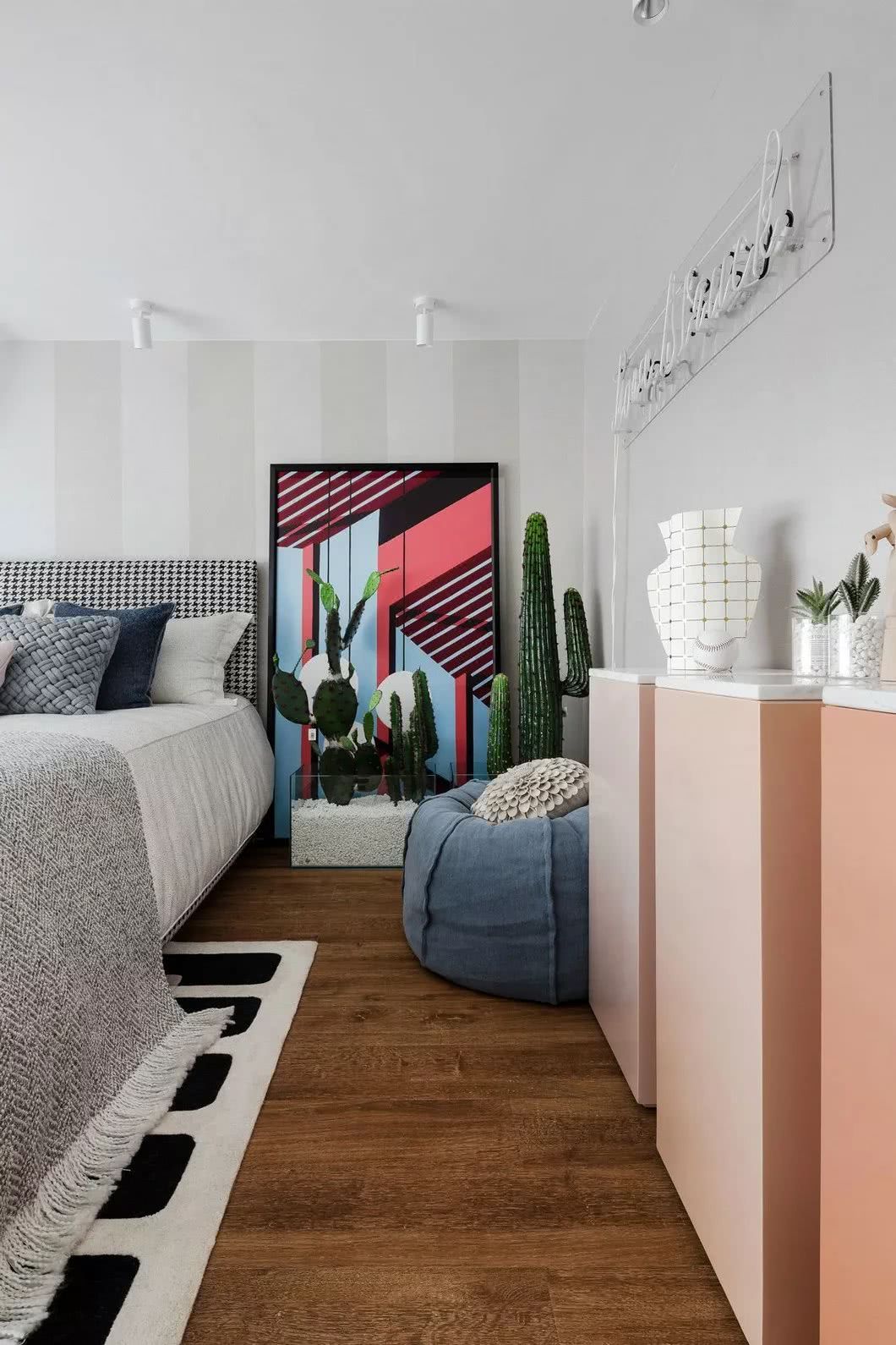 二層主臥內,柚木色和粉色給人一種獨特的溫柔,發光字體裝置與略顯夸張的仙人掌綠植,自帶一份電影畫面質感。