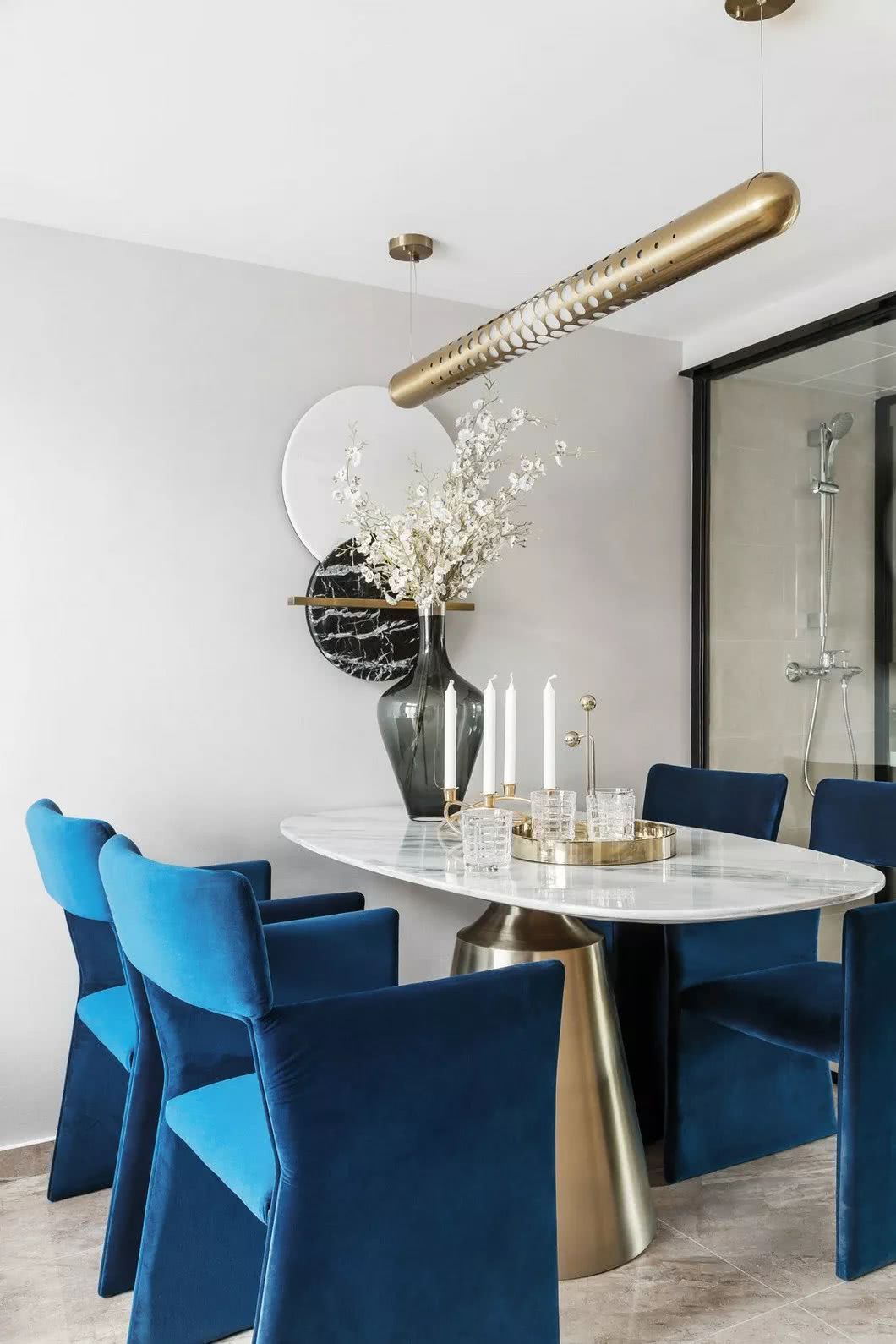 用餐區中,設計師利用石材和毛氈材料的多樣性作為和諧元素。餐椅選擇了一種富有的藍色,仿佛能從視覺上提供觸感。