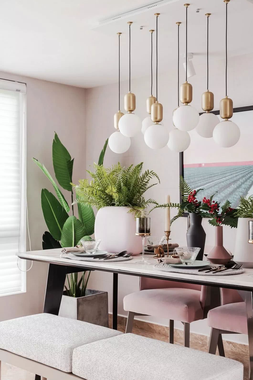而為了調和金屬、石材和地磚所附著的硬朗,在墻飾、燈具和餐桌的選擇上都采用了圓形設計,減少棱角,柔和別致;白色的跳舞蘭生長在玻璃材質的巨大花瓶中,與餐廳的整體色調配合默契,為空間增添了一絲生活情趣。