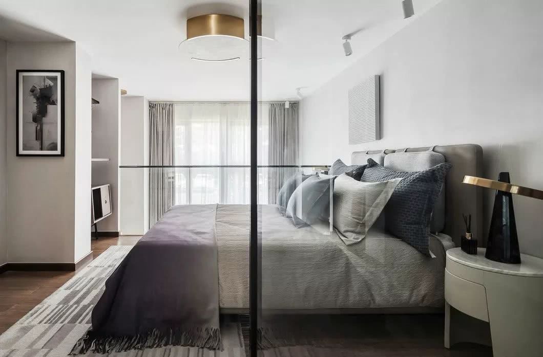 在公寓二層的盡頭是主臥。在臥室的設計選擇上,設計師運用了很多高質量材料來為房間奠定風格基調,木地板在空間中描繪著溫和細膩的紋理,整齊豎直,搭配淺灰色的地毯顏色,呈現出溫柔卻冷冽的色調。