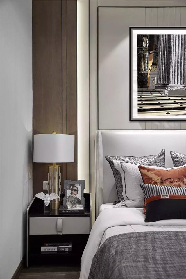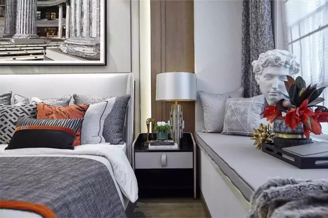 “品味,像清風(fēng)拂動(dòng),像月光揮灑,你只能感受它的存在,卻難以真切地描述它。”主臥是彰顯主人品味的空間,延續(xù)客廳的風(fēng)格特點(diǎn),以灰色和米白作為主色調(diào),以橙色點(diǎn)綴。背景墻上的一尊裝飾物,線與面的錯(cuò)綜交織,主臥中的氛圍似乎有了律動(dòng)的生機(jī),品質(zhì)上乘的床品與軟飾,突出了主人對(duì)于休憩空間的舒適度的追求,更是對(duì)生活哲學(xué)的理解。