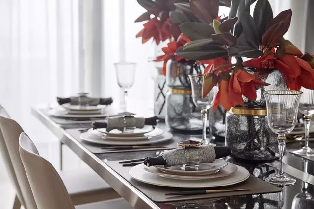 客廳與餐廳呈開放式的格局,自然光透過(guò)落地窗紗照進(jìn),坐收借景,引光,為充滿自然肌理的餐桌注入了一絲細(xì)膩與溫情,墻上一副融合了古典與現(xiàn)代的裝飾畫,與餐桌的植物相呼應(yīng),呈現(xiàn)一個(gè)兼具藝術(shù)與生活氣息的用餐區(qū)域。