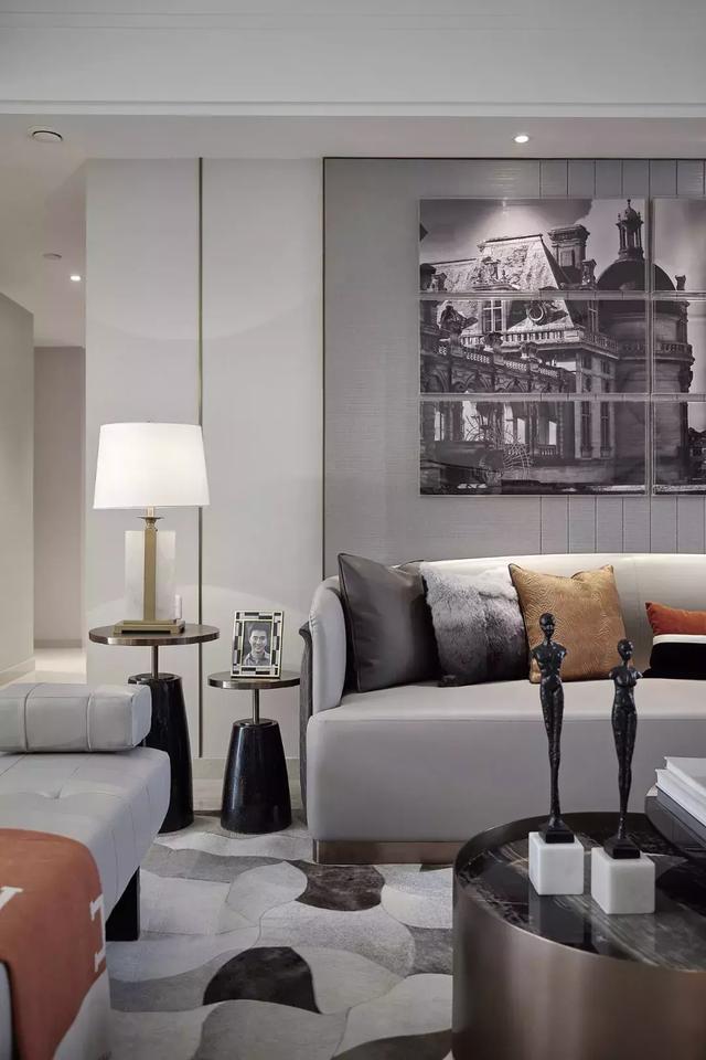 一抹橙,與尊貴奢華的金,在灰白空間中增添了幾分活潑,客廳茶幾上一方希臘神廟擺件的點(diǎn)綴,呼應(yīng)了貫穿空間的古典藝術(shù)元素。