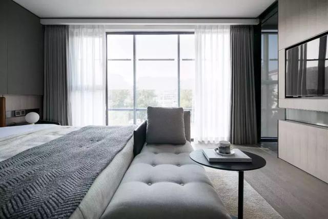 體塊質感的空間處理延續至起居空間,更在于描繪生活的沉靜,閱歷積淀下的品味。舒適、通透、寧靜,是屬于臥室空間的關鍵詞。