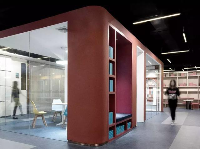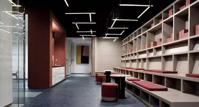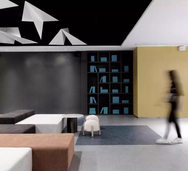 錯落有致的沙發體塊組成公共的休息區,靈活的空間尺度供訪客等待休憩,或是思考或是翻一本書籍……