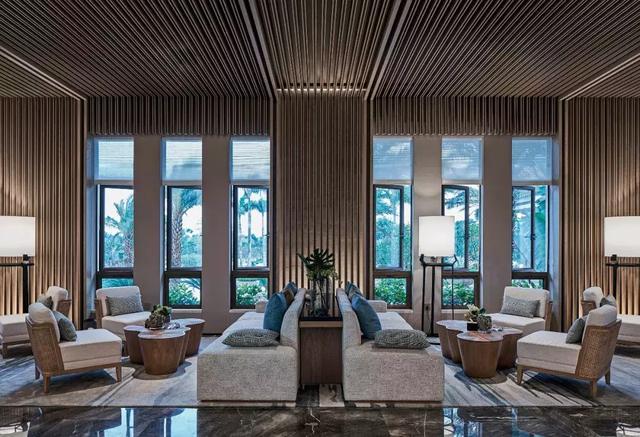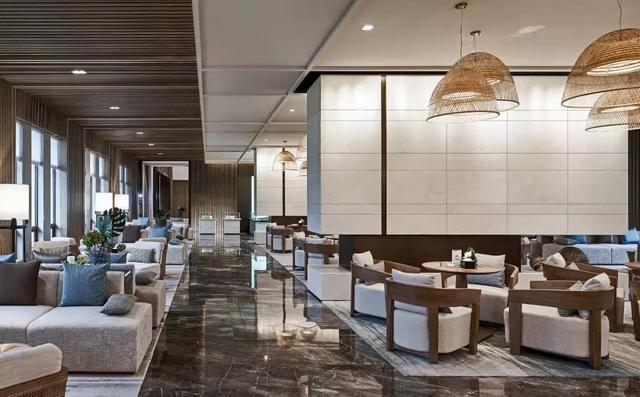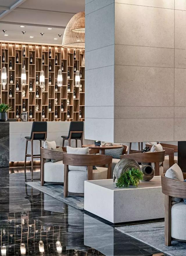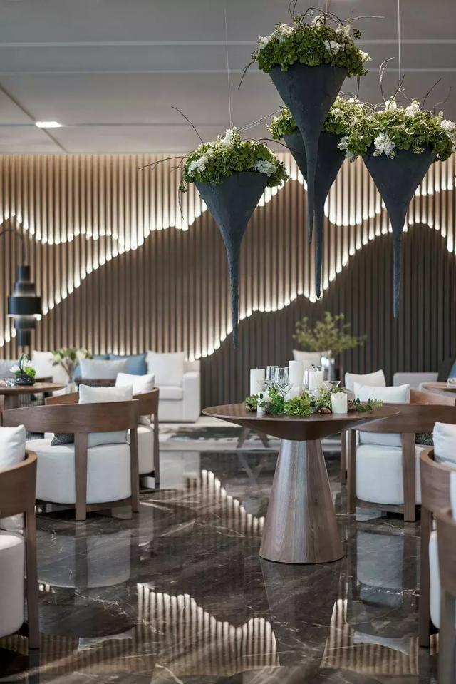 深色大理石地面具有豐富自然肌理,被廣泛運用于大堂空間中,仿佛層山疊巒,又似水紋波動,花木綠植處處點綴,讓人如同置身從林般舒適。