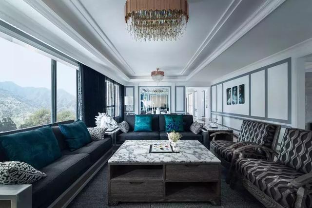 進入客廳,宛如感受了現代與上世紀初巴黎藝術風格在此邂逅。 灰藍色與褐色構成強烈的對比,通過水晶燈具的搭配,渲染上一層奢華情調。后現代風格的壁畫、做工精巧的飾品、金屬線條的燈具,碰撞出極具韻律感的視覺沖擊,無不散發著奢華、雅致的空間氣質。