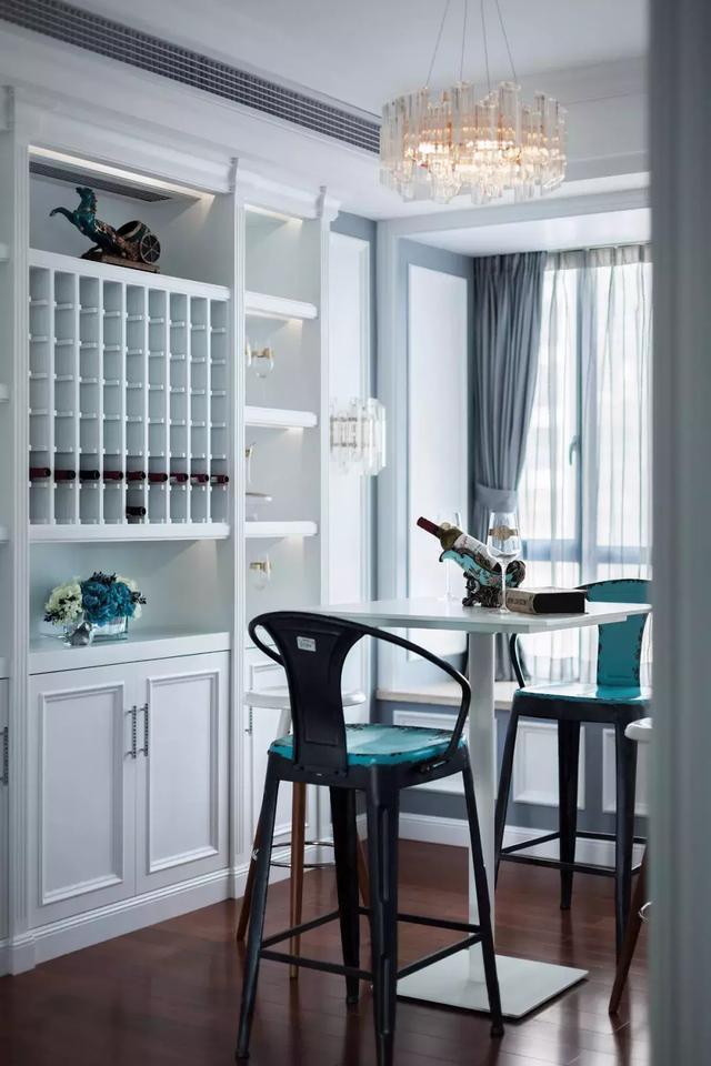 餐廳不失為整個空間的亮點,搭配極富幻想的羽毛裝飾,打造出高雅輕靈的氣質氛圍。藍與白的搭配,帶來極為舒適的視覺變化,互相融合交織共奏。輕嗅滿屋芬芳,隔著屏幕也能感受空氣中曼妙的甜香。