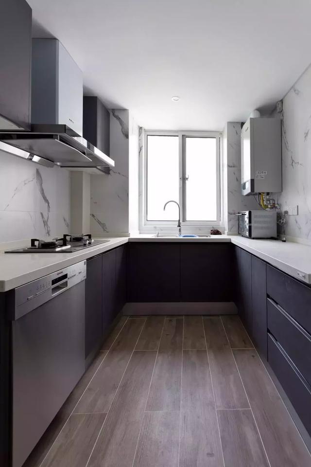 三口之家,對于次衛的要求并沒有太高。但是對于廚房的要求很高,所以將原本的廚房跟為衛生間的墻體敲掉,將墻體整體向衛生間移動了24公分,剛好把衛生間的下水管包起來,這樣淋浴房的墻面也平整了很多。廚房的色彩這沿用的客廳的白色,櫥柜選擇了灰色櫥柜,在色彩上有個對比,地面則沿用了客廳的木紋地板,以求色彩的整體性。