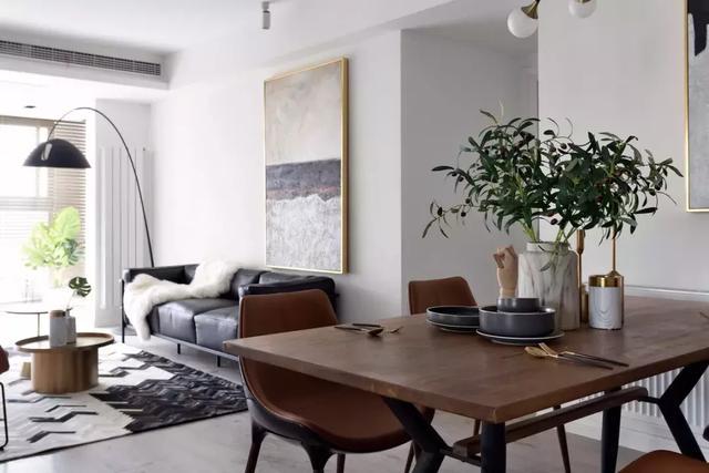 餐廳角度看客廳,硬裝以白色為主。原木色的餐桌中和黑色冷感的黑色牛皮沙發,使得家居氣質融合。