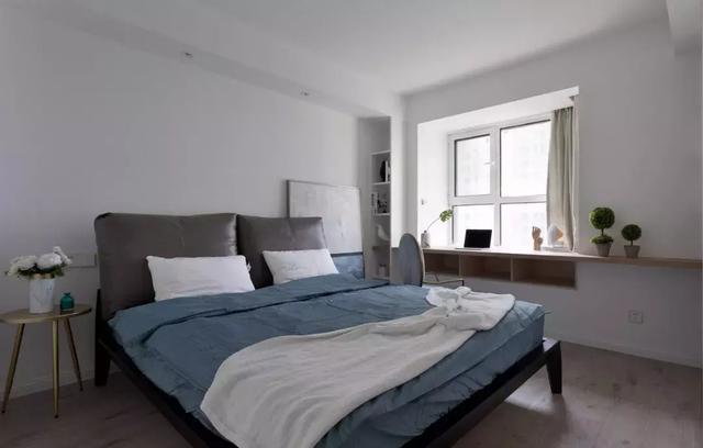 太太會有很多時候在家加班,特別要求要在主臥室增加書桌的位置。加班到很晚就可以直接躺床上休息了,但是主臥室的空間相對局促,幾乎已經沒有合適的位置放置書桌了,設計師把原結構的飄窗臺進行了改造。改成了一個很大很舒適的工作臺,充分利用了原結構的空間。因為窗臺的高度只有55公分,所以我們設計的時候把窗臺的高度加高,桌面跟飄窗臺中間做成了開放的書柜。并且整體往臥室這邊延伸了30公分的寬度,留出放腿的空間。這樣就將原來比較雞肋的飄窗,變成了一個非常實用的大寫字臺,真的非常的實用。