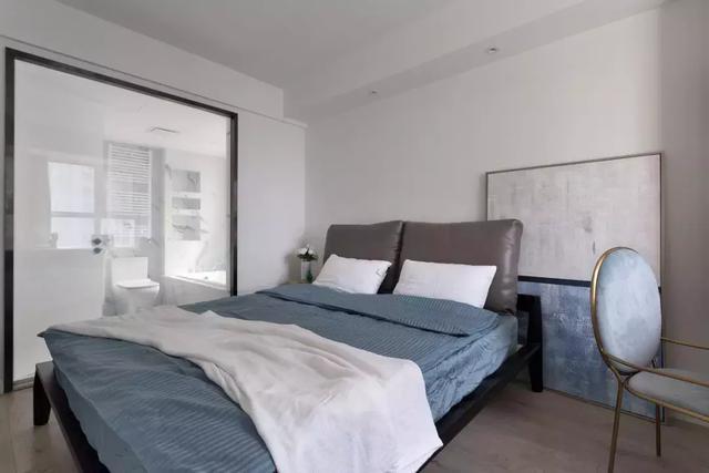從臥室的這個角度可以看到一大面的玻璃,這個是業主的設計要求,想做一整面的大玻璃,原本我們設想是主臥室跟衛生間的整個隔墻都拿掉,用玻璃來代替。后來深入溝通過,業主對于浴缸的要求有點特殊,她們不太喜歡獨立感,覺得有衛生死角,最終還是覺得買嵌入缸,但是這樣一來,就會有一個浴缸的斷面,透過玻璃能看清,所以后來變更了方案,決定把靠近浴缸的位置用磚砌墻體90公分,其余的部位做玻璃。業主雖然說要玻璃效果,對于私密性的要求還是有的,所以這邊我們用了通電玻璃的設計,透明模糊可任意切換模式。并且四邊用黑色不銹鋼做了收邊。對于通電玻璃的運用一定要注意,玻璃跟電線連接處要預留尺寸做收邊處理。