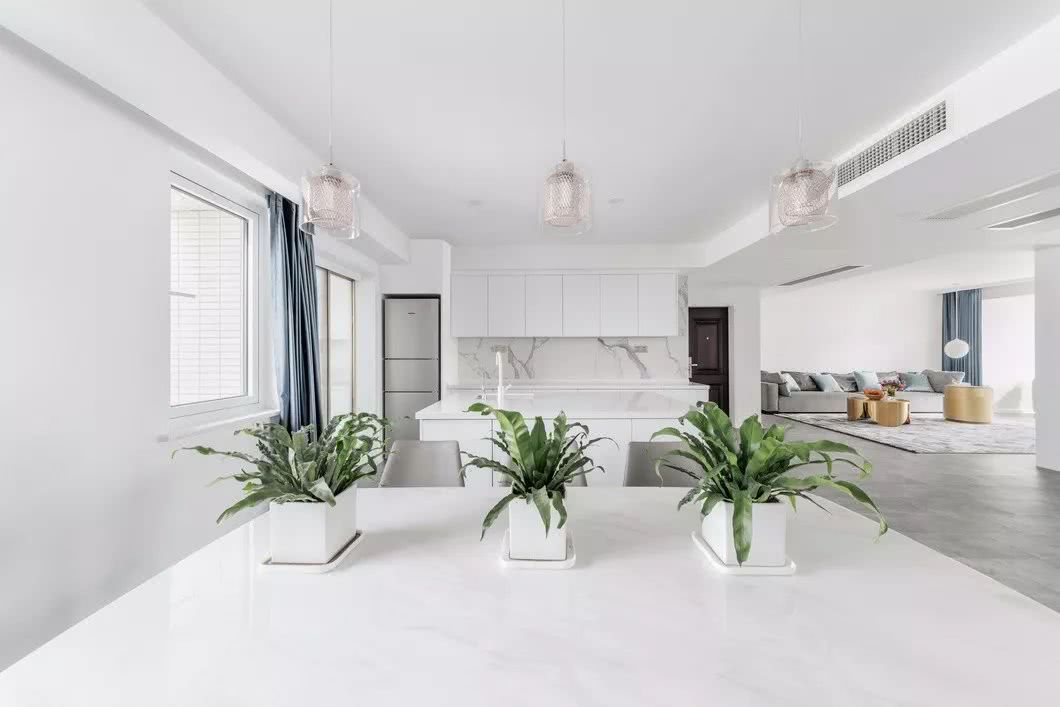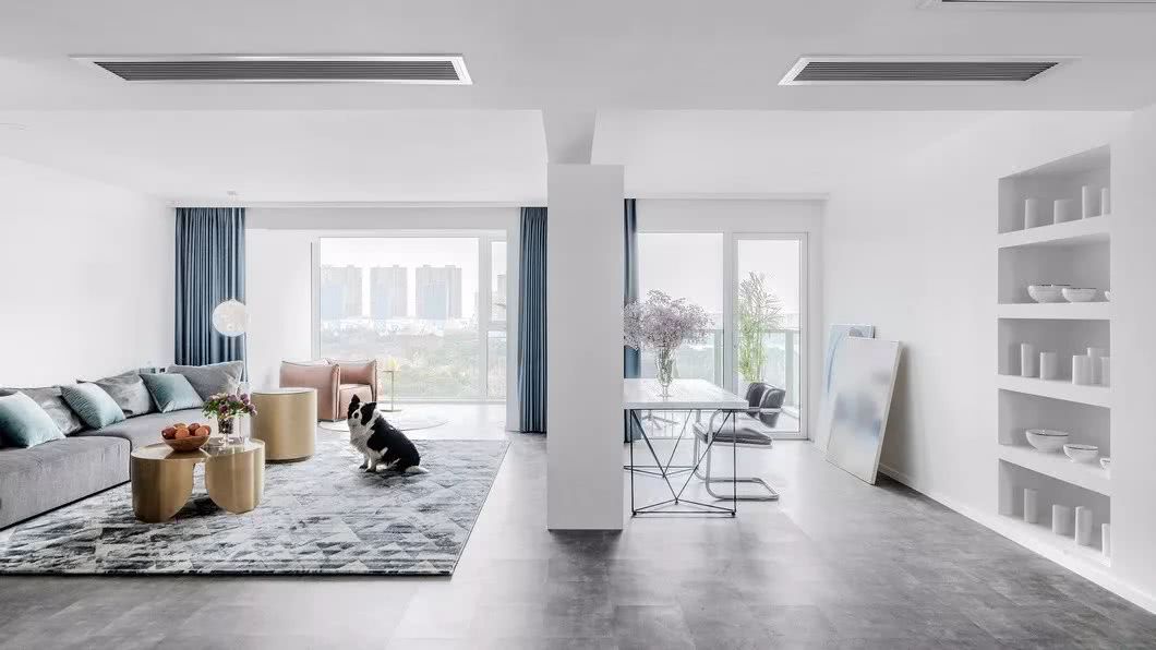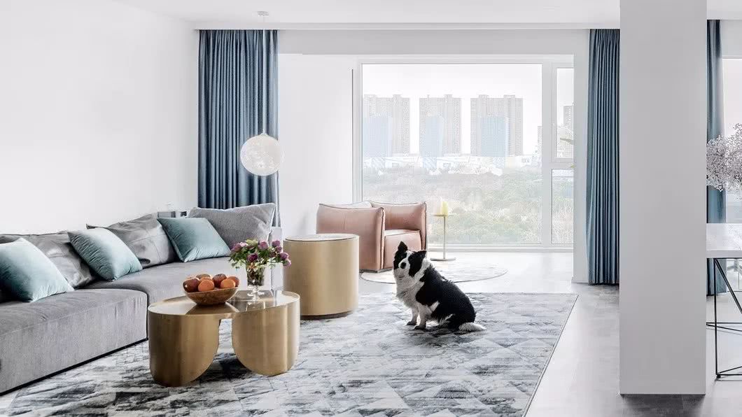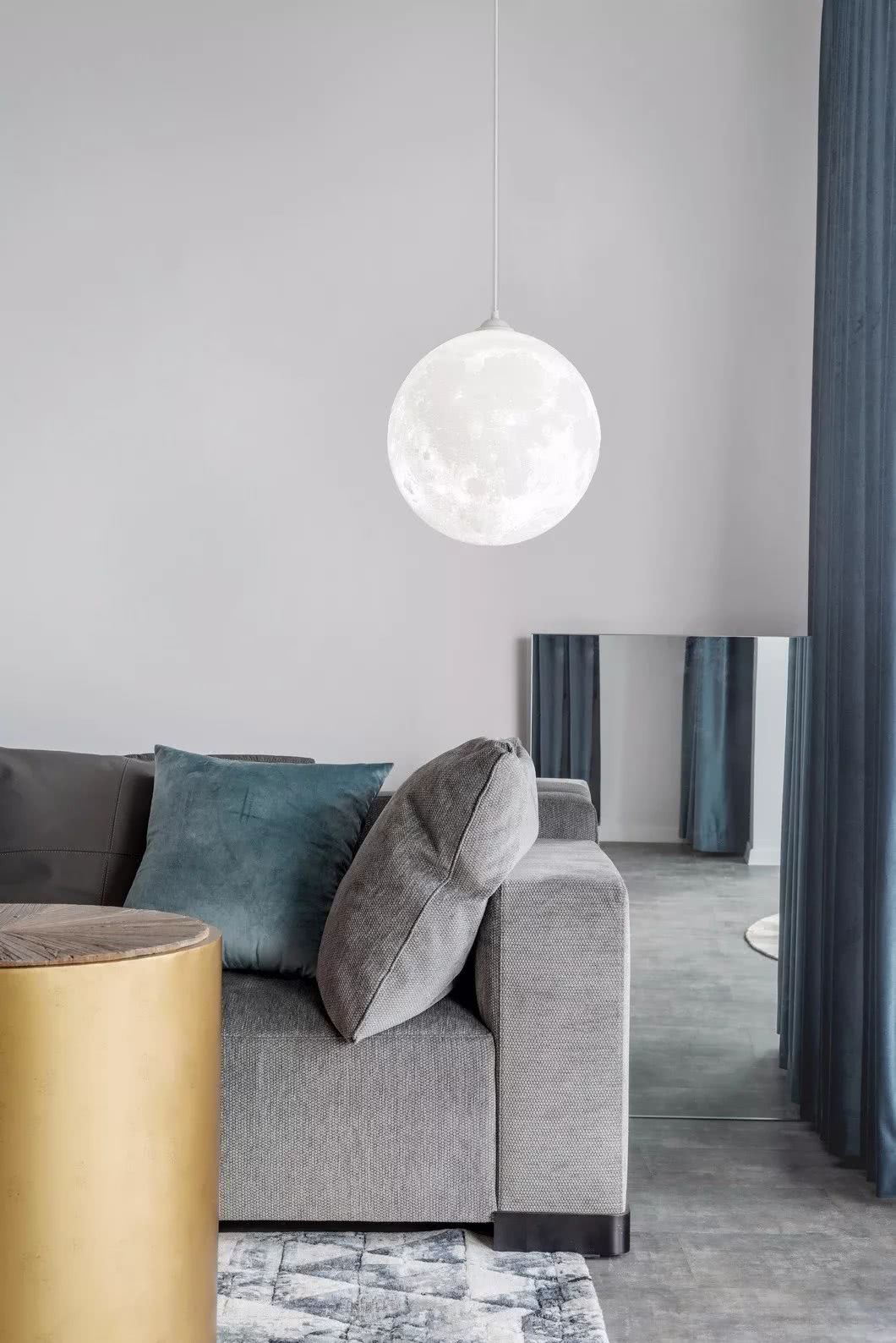 個性的吊燈與金屬的茶幾以及布藝的沙發搭配,