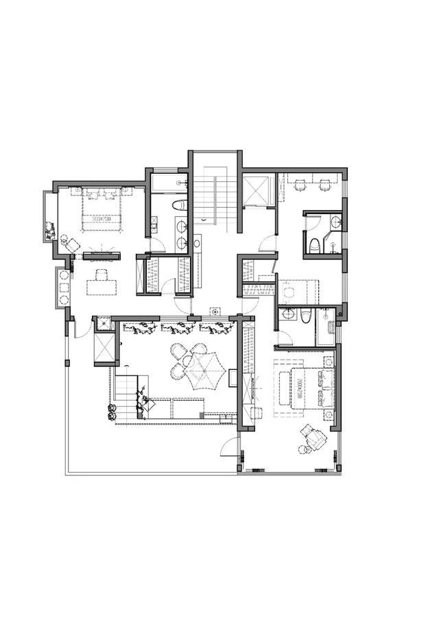 一層作為家庭的主要休閑功能區,禪茶一體,酒通仙道。色彩和肌理作了一個有別于其他的轉變,原石粗礦與鐵板細膩的對比,為入口旁玻璃封閉的酒窖多了幾分趣味;多功能室白色墻頂界面區分、黑色雞翅木家具、質樸的石材墻面,靜謐而沉穩;