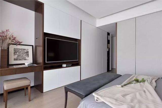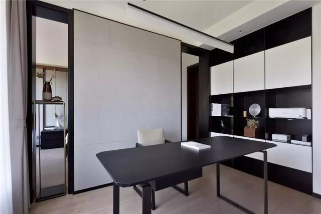 套臥打破原本臥室的封閉格局,取而代之的是書房和臥室相連的開放空間,將材質肌理與空間比例組合變化彼此呼應,形塑一貫的整體感。材質方案元素在空間中組合變化貫穿于各個空間,低灰度材料對比,窄邊線條勾勒游離于界面形體之間,構建出空間的質感與內斂。