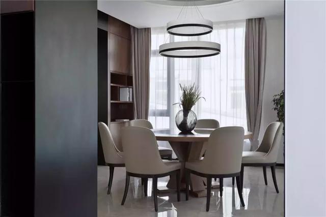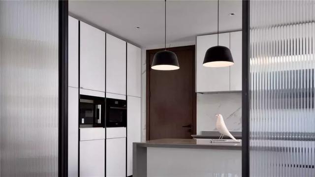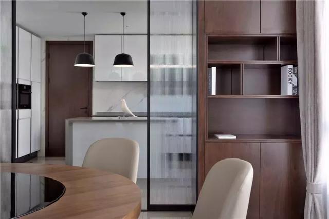 此刻,從空間角落透出餐廳的模樣,餐廳廚房一體的開放式空間,利用移門玻璃介質的開合達到空間觀感的最大化,縱向紋路的玻璃朦朧質感和低彩度的細膩木飾面材質關系,光影變換下的明暗轉換多層次刻畫。到此,空間呈現為一個完整的序列。