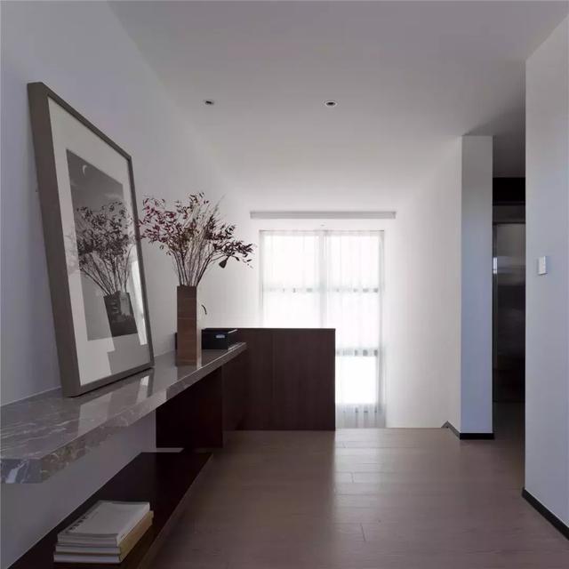 經由樓梯來到三層空間,一簾連續的白色柔光輕盈的落在過廳里,懸挑臺面成為空間的焦點。