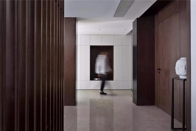 主入戶位于二層,門廳試圖通過不同材質和顏色對比來界定空間的屬性和層次感,白色壁柜作空間背景,內嵌壁龕為視覺焦點。