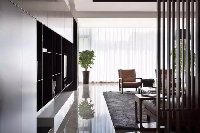 從入戶的開始,便是利用自然光線的介入來轉換入室的情緒感受,入廳轉折后便是門廳和客廳過廊,藉由客廳沙發后的木制格柵過濾空間光線,在分隔客廳空間與入口走廊的同時,也維持了空間內通透與開敞的氛圍,隨影入畫柔和引導空間的轉換。