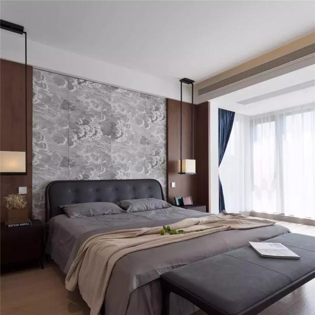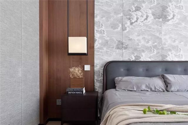 長輩房整體設計低調而內斂,空間擁有了歲月靜好的力量,藝術壁紙柔化空間的同時,跳脫出嚴謹的幾何形體,蘊藉出一份愜意的休閑氣氛。