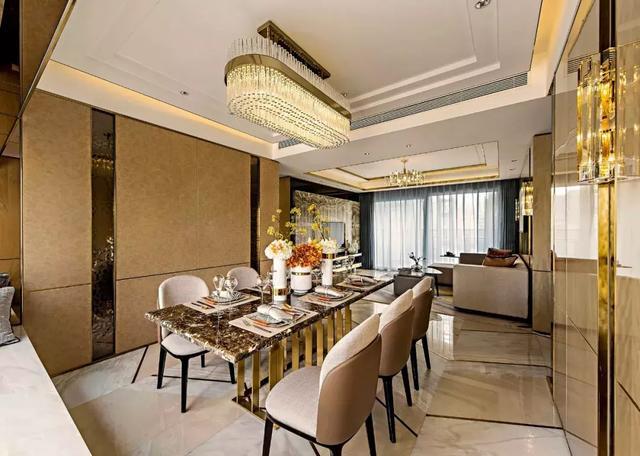 幾何藝術首先體現于客餐廳地面三種石材與不銹鋼的結合,設計概念來自于鉆石的切割藝術,營造出奢華而不失內涵的空間氣質。