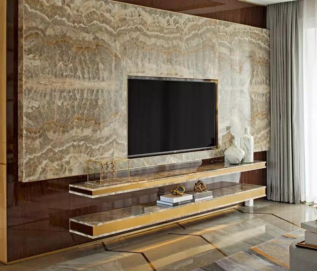 電視背景墻面顯現著玉石的天然紋理,與隔空相對的抽象藝術掛畫完美呼應。