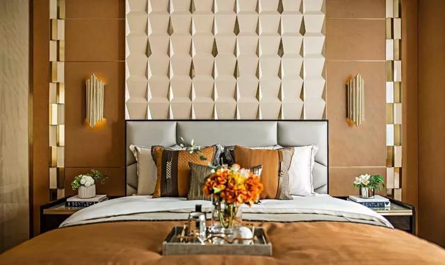 從鉆石中提煉出的設計元素亦延續到整個空間鋪陳中,包括臥室木地板的菱形鋪裝方式、床頭背景墻的特色幾何裝飾、墻面鏡子的幾何刻花圖案,以及衛生間的特色馬賽克搭配等,共同成就了奢雅卻不浮華的家居場景體驗。