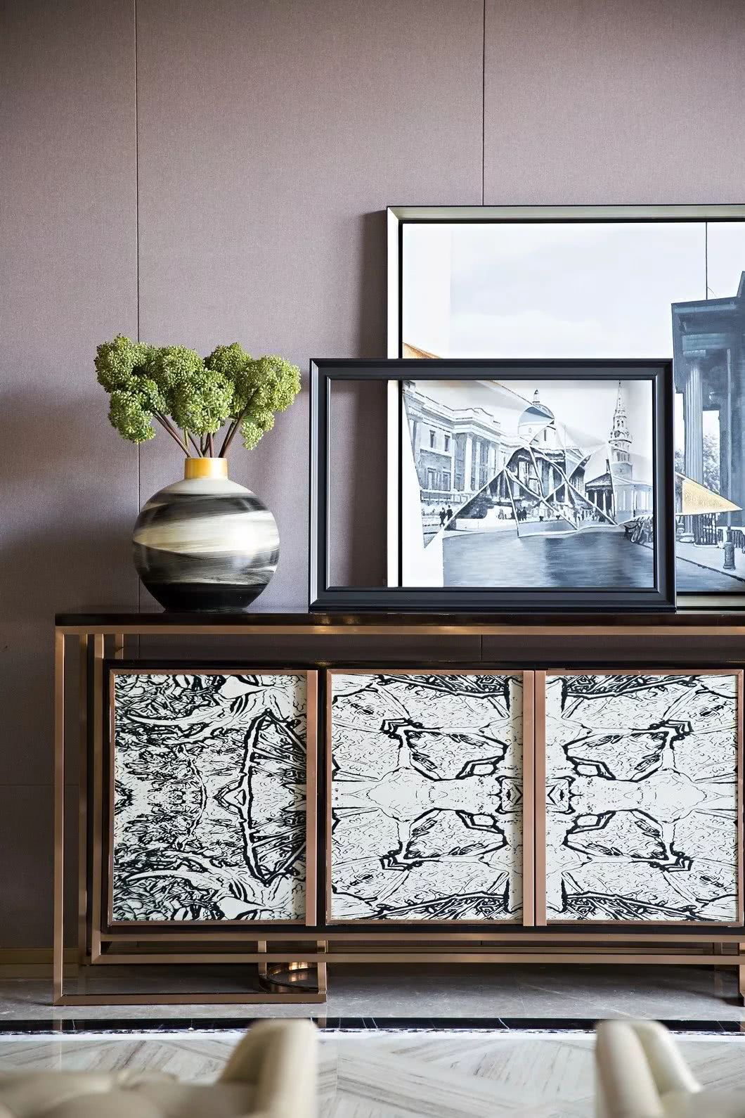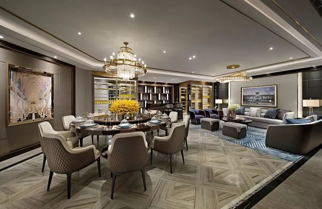 漫步至宴客廳,采用了視野開闊的開放式格局,時尚大氣的高級定制家具和寬敞的空間演繹世家風度。