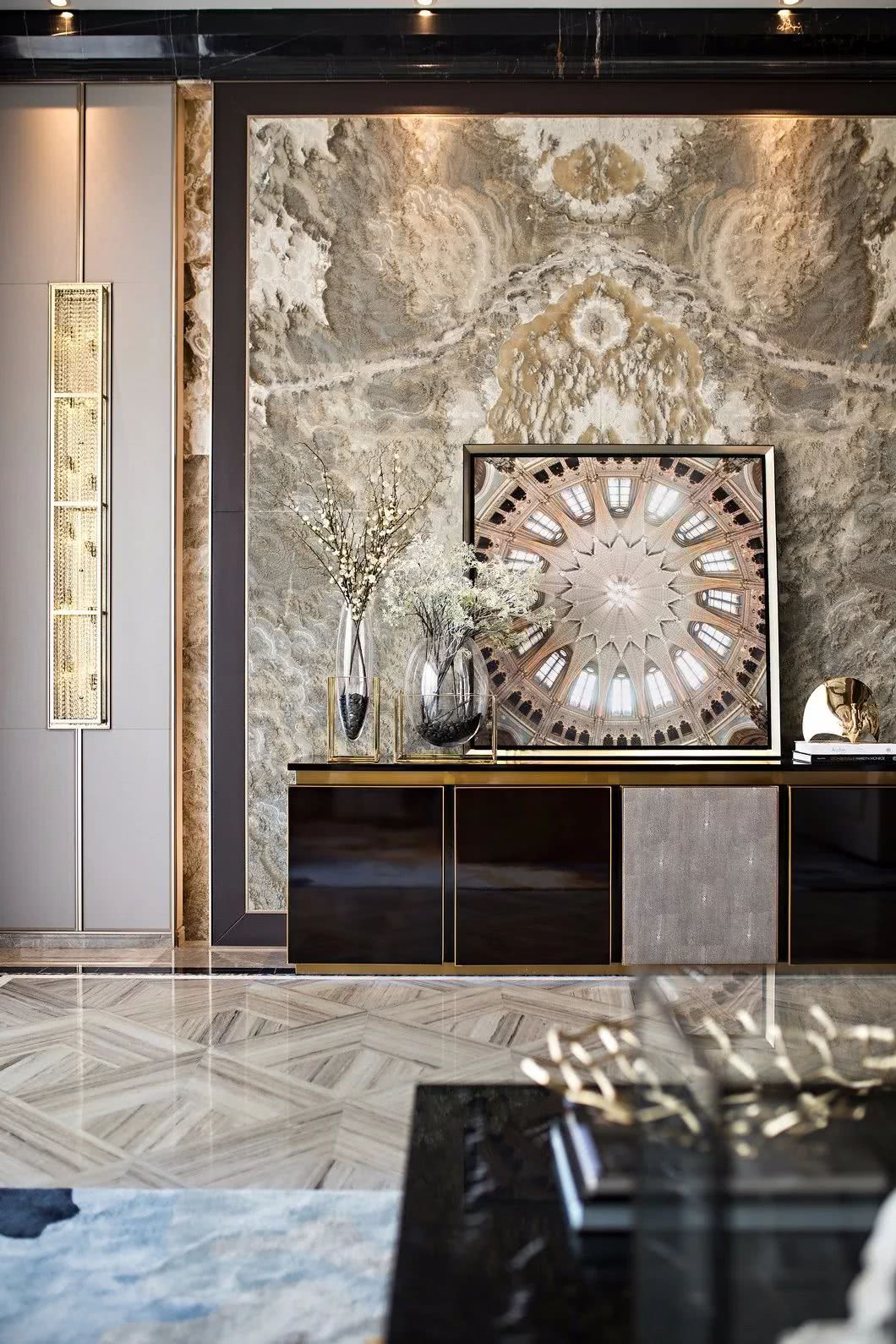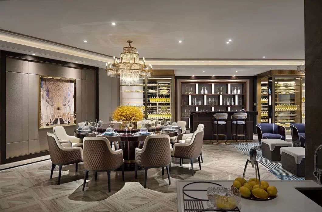 另一側的餐廳以設計的語言將藝術和創意灑落在生活的細節處,創造性地將地面采用水晶木紋石幾何拼接,同時對餐廳的格調作了延續,如金屬框架的玻璃紅酒架,深色簡約餐桌和米灰皮餐椅的搭配,讓人們深入空間不自覺地感受到一股暖流和時尚輕奢風在空間碰撞交響。這是家的味道,也是幸福的味道。