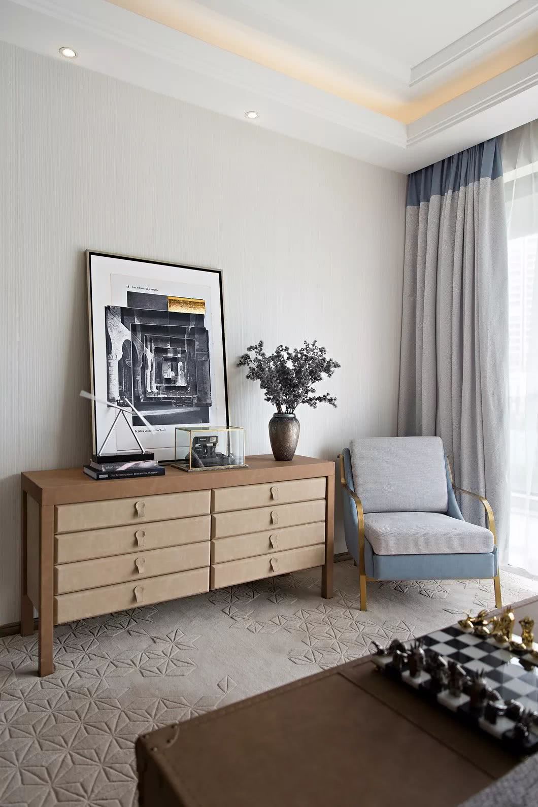 拾階而上,三樓是別具現代輕奢感的主臥。設計風格延續了“港式格調”的線條感,淺灰色的低調、米色的柔和,在看似簡潔質樸的外表下隱藏著低調的貴氣感,營造出舒適愜意的睡眠環境。
