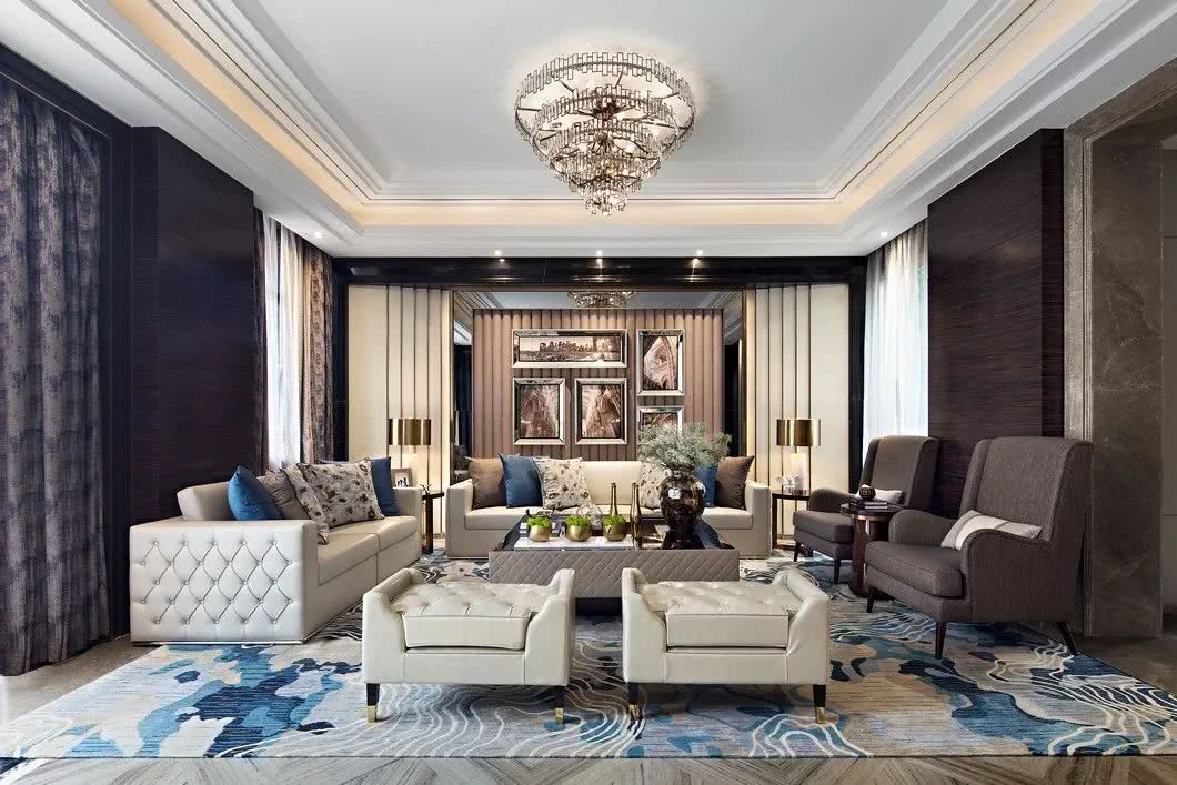 通過精簡靈動的曲線,在創意吊燈、地毯等不同的“形”與“色”融為一體,突顯藝術品位,瞬間有一種浮華過境般浸染了整個空間的畫面,似時光留駐,又有幾許悠然。