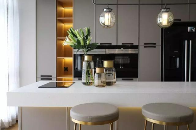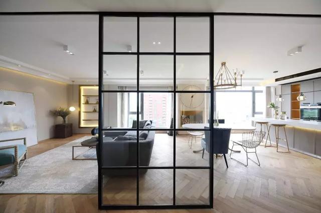 整個空間運用大量的建筑細節,例如老鋼玻璃門照壁、帶有復古花紋的冷軋鋼通風口、內嵌的古銅裝飾壁爐以及白色文化墻、臥室模仿自然光照明的廊架造型燈帶等等,這些細部給空間帶來豐富性和獨特個性。