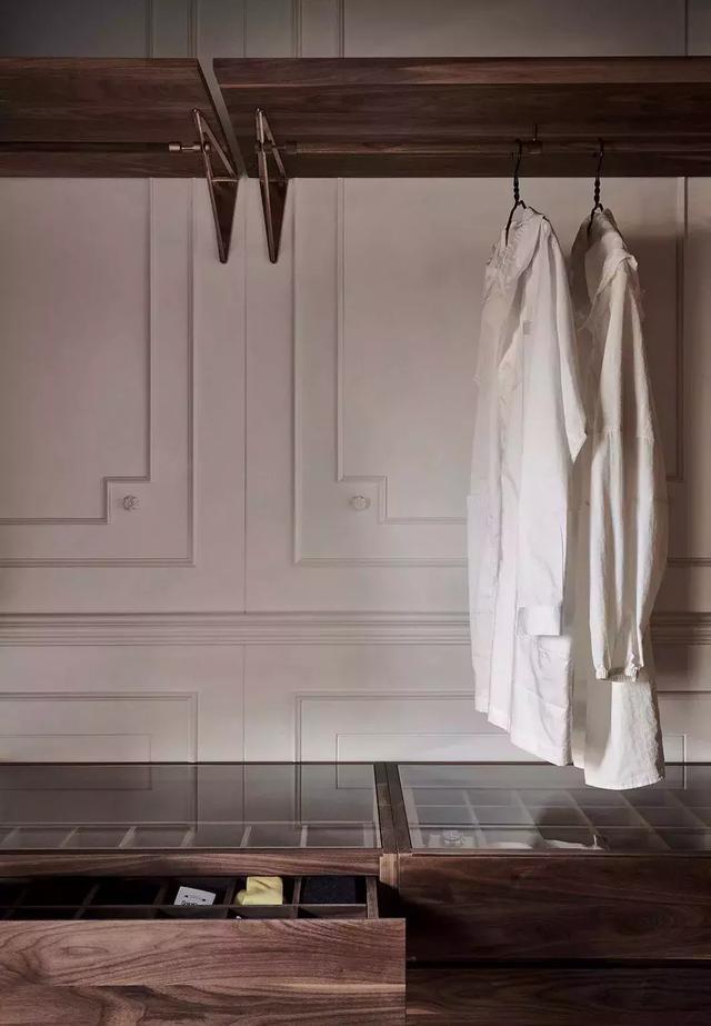 一個更具風格的美學用于私人住宅,墻上裝飾著經典的白色木鑲板,地板上裝飾有硬木鑲木地板,兩者都巧妙地用于天花板上,前者在兩間臥室和更衣室中使用;后者描繪了連接這三個房間的各種走廊。