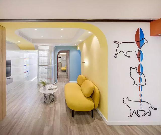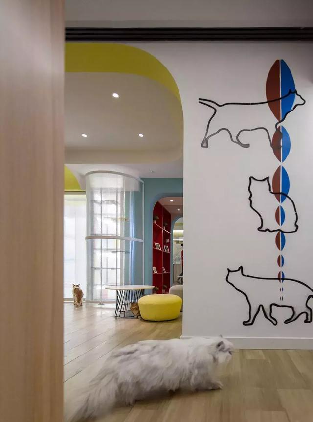 入口玄關頂部的設置有一個通長的圓拱,側壁結合貓的尺度繪制了紅藍尺。